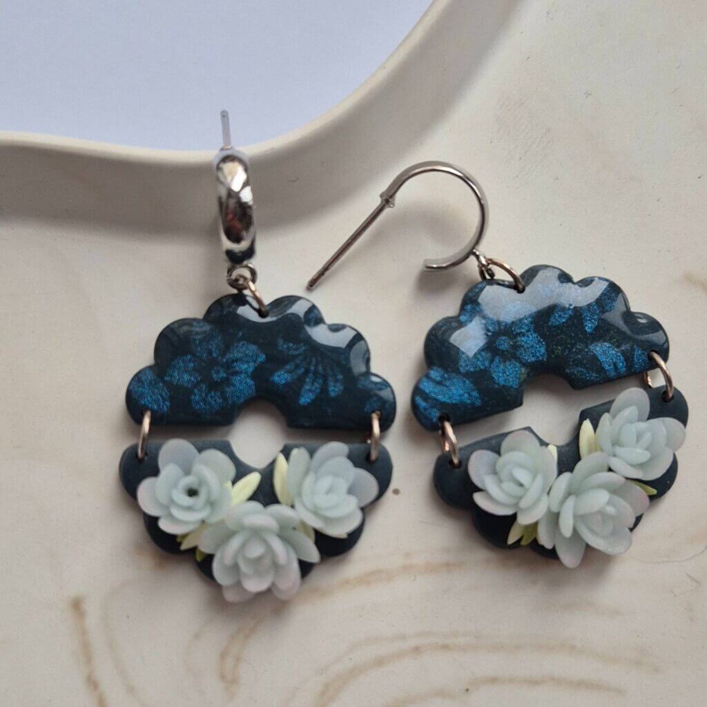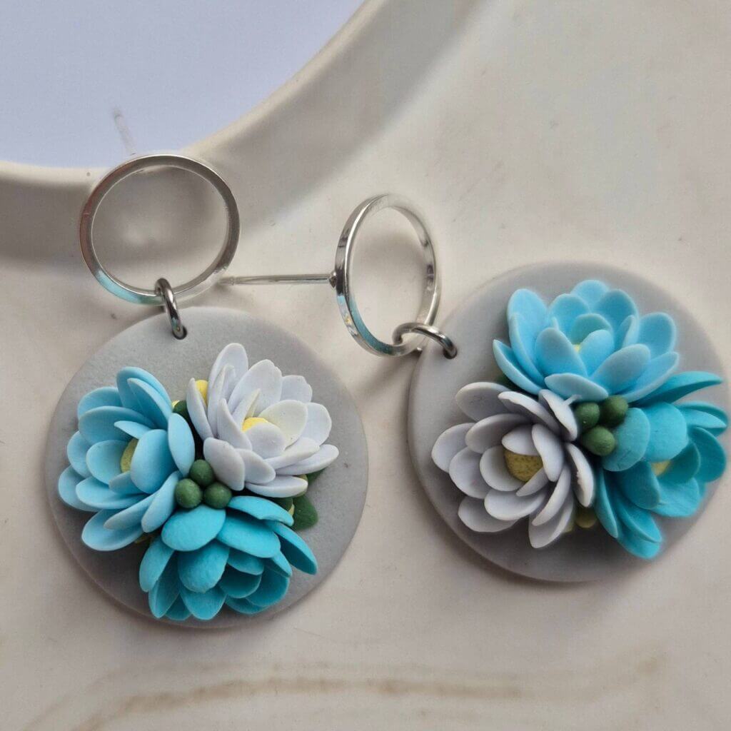 detaliu cercei lut polimeric cu buchet de flori albastre tortite cercei otel inoxidabil