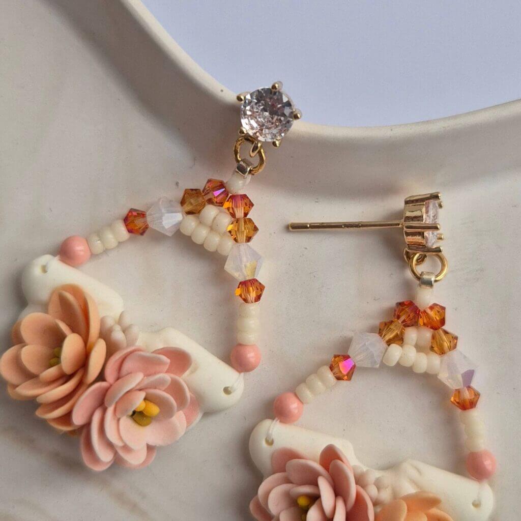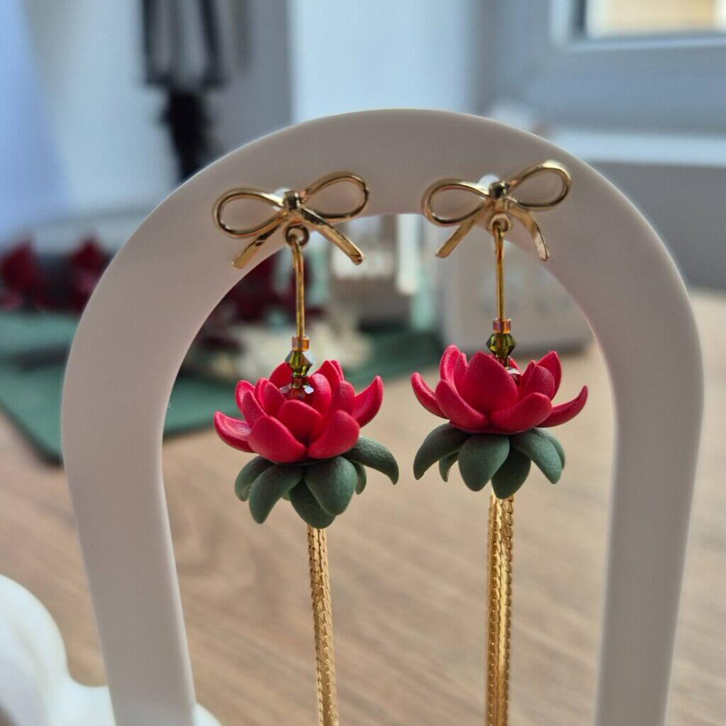 cercei din lut polimeric in forma de lotus si cristale cu accent pe forma tortite din otel inoxidabil